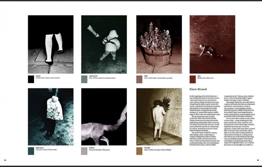 Between 1886 and 1903 booth surveyed the life and labour of the people in London, moving street to street interviewing the residence. The Booth study resulted in, amongst other things, colour-coded maps of London ranging from yellow to black, with blues, pinks and reds in-between. These colours represented the income and social positioning of the city’s inhabitants, from the lowest class, controversially categorised as the ‘Vicious, semi-criminal poor’ to the less harshly judged ‘Upper-middle and upper classes. Wealthy.’